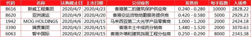截止目前,暂定在4月上市的新股有5家。这五家公司的行业也各不相同,涵盖了中成药健康护理品、眼镜业、空运地勤和建筑服务。截至4月1日下午16:00,已有3只新股公开发售获足额认购,分别是满贯集团、亚洲速运和MOG HOLDINGS。