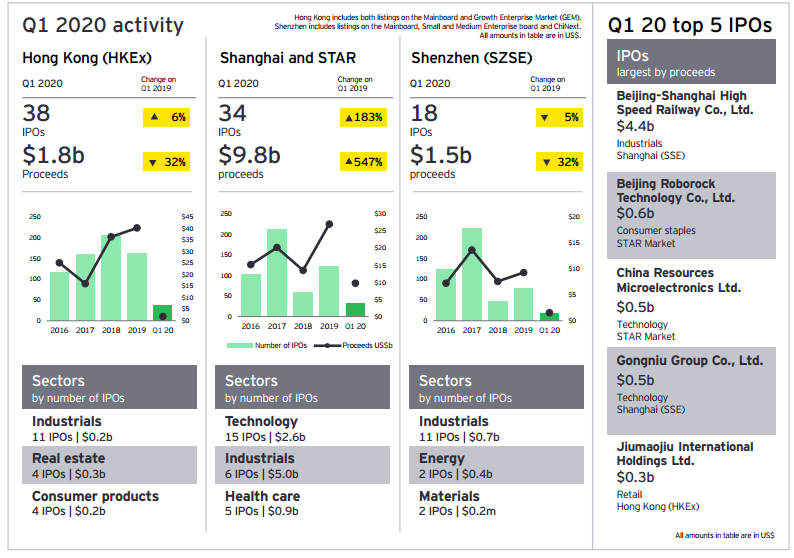 但受到新冠肺炎疫情影响,港股市场一季度跌幅较大。2020年第一季度,香港恒生指数从1月2日收盘的28543点跌至3月31日收盘的23603点,跌幅为20.9%。部分公司或出于担忧,考虑延迟IPO时间。
