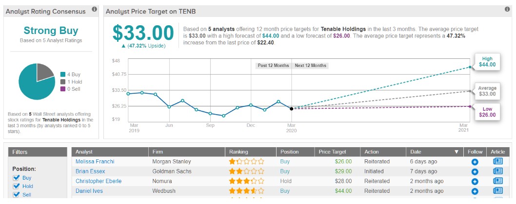 从市场共识的分析来看,华尔街对Tenable其实是持乐观态度的。在过去三个月给该股发行过4次买入和1次持有,迫使该股票成为强力买入。其33美元的平均目标价格表明当前股价有47%的上涨空间。
