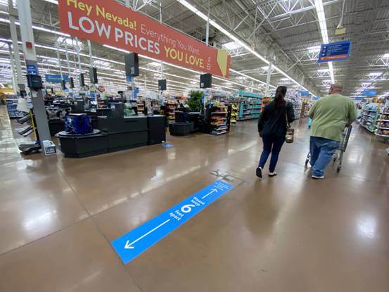 沃尔玛超市内使用的提示保持社交距离的地标(图源:Las Vegas Review-Journal)