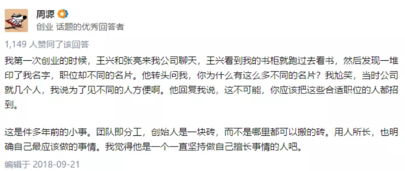 周源说,「这是件多年前的小事。团队即分工,创始人是一块砖,而不是哪里都可以搬的砖。用人所长,也明确自己最应该做的事情。我觉得他是一个一直坚持做自己擅长事情的人吧。」