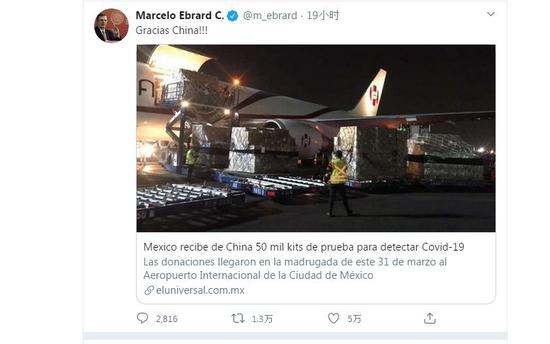 北京时间2日消息,墨西哥外长马塞洛·埃布拉德(Marcelo Ebrard)在社交媒体平台推特上发帖,感谢中国慈善机构捐赠医疗用品,以帮助墨西哥阻止新冠病毒疫情。