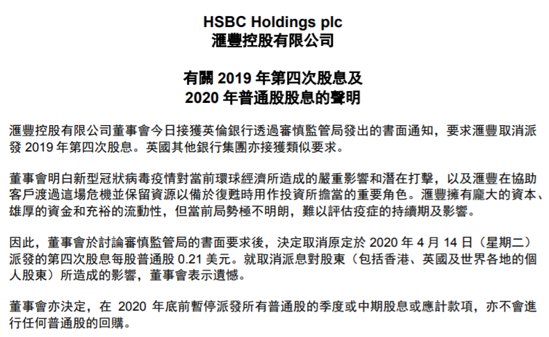 3月31日,汇丰控股(0005.HK)公告,称由于监管层的要求,董事会决定取消于4月14日派发的第四次股息(每股普通股0.21美元)。同时,在2020年底前暂停派发所有普通股的季度或中期股息或应计款项,亦不会进行任何普通股的回购。