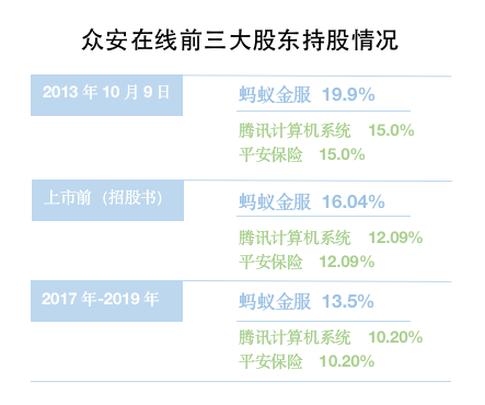 众安在线最初由蚂蚁金服、腾讯、平安保险发起设立,至今,这三大股东所持股份都稳居前三,其中,蚂蚁金服一直位列第一大股东席位。