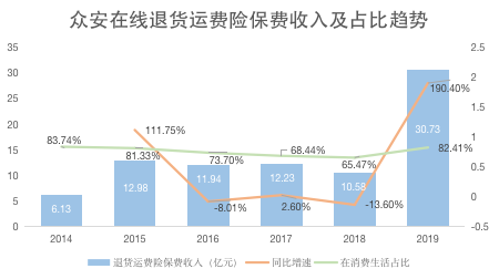 生活消费生态的主要产品是退货运费险,由众安在线与蚂蚁金服合作为淘宝、天猫提供。2019年,其退化运费险保费收入30.73亿元,在整个生活消费生态中的保费占比再次超过八成,回到2014年、2015年的水平。