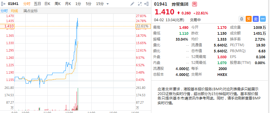 华盛资讯4月2日讯,物业次新股烨星集团午后迅速拉升涨超20%,截至13:34涨幅22.61%,报价1.41港元,最高涨近30%。当前成交额1451万港元,市盈率为19.5倍,当前总市值5.64亿港元。