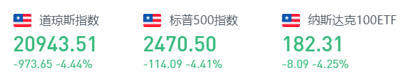 美东时间周三,三大股指全线下挫。截至收盘,道指跌973.65点,或4.44%,报20943.51点;纳指跌339.52点,或4.41%,报7360.58点;标普500指数跌114.09点,或4.41%,报2470.50点。