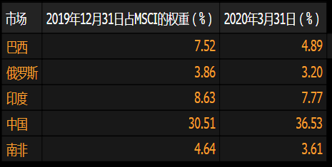 中国在股指中占比提高之际,其余金砖国家--巴西、俄罗斯、印度和南非--却有所下滑,这些国家疫情仍处于早期阶段,经济影响也不甚明朗。