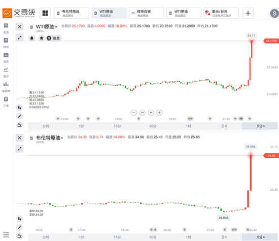 北京时间周四晚间,美、布两油快速拉升,布伦特原油短线拉升0.8美元,WTI原油短线拉升0.5美元。据路透报价,WTI原油期货一度涨超30%,布伦特原油期货最多涨超45%,现已收窄涨幅。另一方面,美股石油股通胀扩大涨幅,斯伦贝谢(SLB.N)涨13.11%,康菲石油(COP.N)涨12.34%,哈利伯顿(HAL.N)涨11.74%,荷兰皇家壳牌(RDS.A.N)涨11.21%,雪佛龙(CVX.N)涨9.79%。
