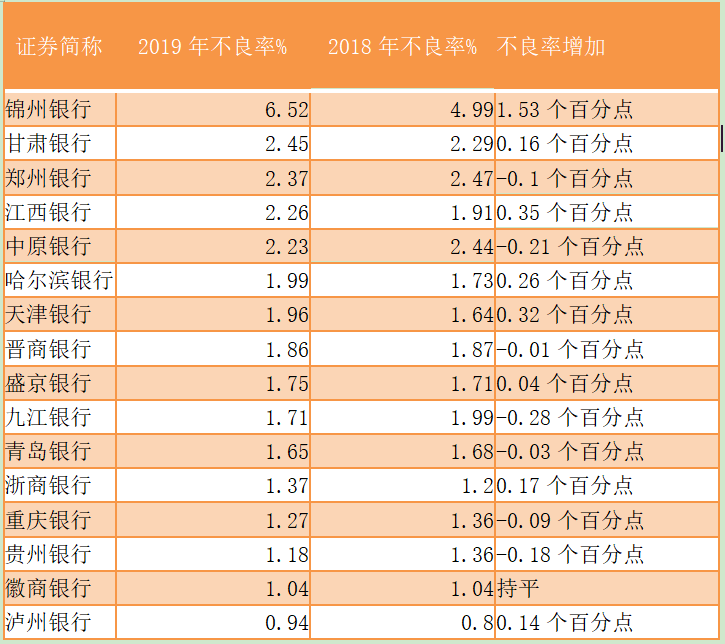 其中,锦州银行在2019年不良率达到6.52%,较2018上升1.53个百分点;甘肃银行不良率为2.45%,较上一年上升0.16个百分点;江西银行不良率为2.26%,较上一年上升0.35%个百分点;天津银行不良率为1.96%,较上一年上升0.32个百分点。