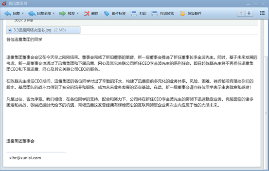在迅雷员工内部信中写道:“我们相信,在各位同学的支持、配合和努力下,公司将在新任CEO李金波的带领下迅速稳定业务。克服面临的诸多困难和挑战,敏锐把握时代给予的机遇,带领迅雷这家曾经拥有辉煌历史的互联网领军企业再次走向应属于他的光明未来。”据悉,本次高管人员调动的原因主要是基于公司未来发展的考虑。(大鹏)
