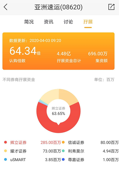 华盛资讯4月3日讯,亚洲速运认购第四天截至09:027,公开发售部分孖展倍数64.34倍,辉立、华盛等券商共计为其借出4.48亿港元,当前距离认购结束还有6天。