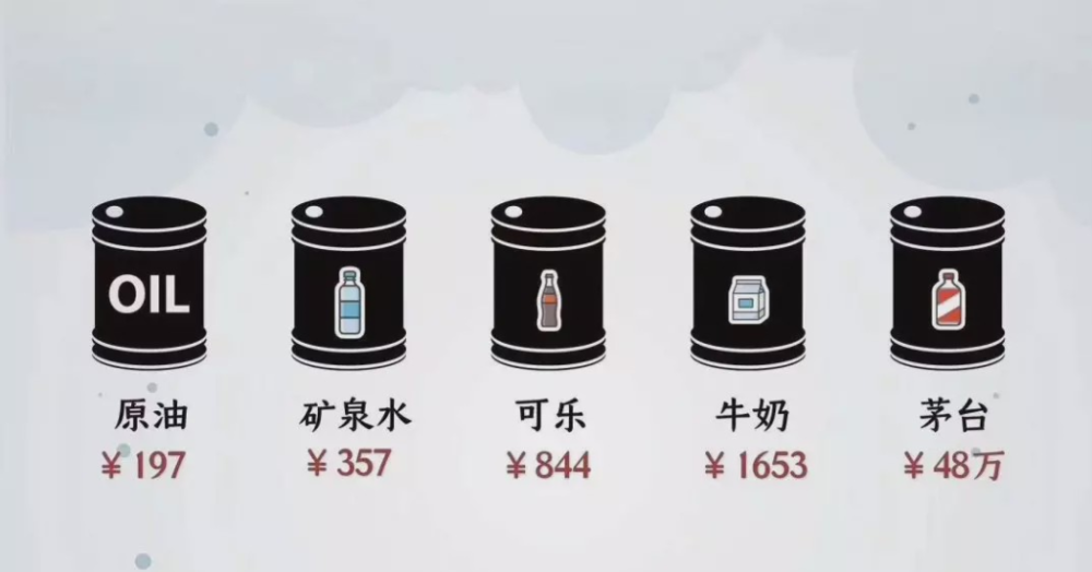 贴心的网友比较了原油、矿泉水、可乐、牛奶以及茅台的价格,并制作了这张图。