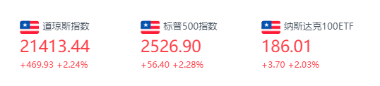 截至收盘,道指涨469.93点,涨幅2.24%,报21413.44点,全天振幅近800点,纳指涨1.72%,报7487.31点,标普500指数涨2.28%,报2526.90点。