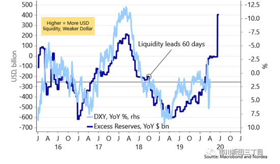由于大宗商品价格下跌以及全球贸易活动减少,全球美元资金的换手率以及美元流动性的流通速率因此出现了明显的下降,这是美联储需要提供美元流动性的诸多理由之一。当全球贸易总量的跌幅达到当前所目睹的4-5%,美元汇率通常会升值约10%。