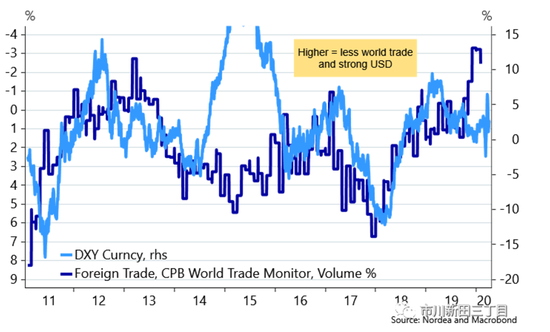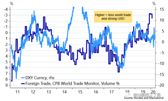 图5:当全球贸易活动放缓美元汇率会升值,因全球金融体系中的美元流通量会减少