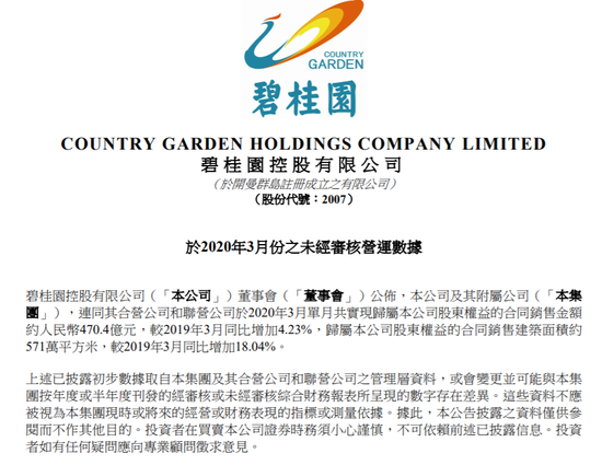 4月3日,碧桂园在港交所公告:3月实现合同销售金额约470.4亿元,同比增长4.23%。归属本公司股东权益的合同销售建筑面积约571万平方米,较2019年3月同比增加18.04%。