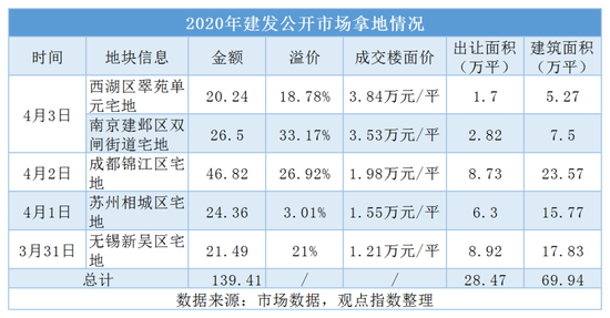 4月3日,南京和杭州分别集中出让3宗地及8宗地块。其中,建发先以26.5亿元摘得南京建邺区双闸街道宅地后,再以20.24亿元获得杭州西湖区翠苑单元宅地,单日两城拿地合计46.74亿元,均以溢价成交。