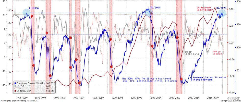 许多交易员正在反复思考,是否要继续交易美国市场及其引领的全球市场的技术反弹(《是美联储黔驴技穷,还是市场艰难寻底》,20200324)。但周期之轮已经开始转动。在图表2中,我们展示了美国消费者对当前形势的信心在过去美国经济衰退之前是如何变化的:其峰值往往会领先美国经济衰退大约6至12个月。在本轮周期中,这一信心指数在2019年第四季度左右见顶,而见顶的位置与1968年末和2000年年中的水平类似。去年四季度见顶之后,这个信心指数开始回落。与此同时,美国股市市值/国内生产总值(GDP)的比率也已经大约在同一时间见顶,见顶的位置也接近2000年初的水平。
