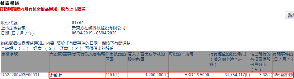 根据联交所最新权益披露资料显示,2020年4月2日,新东方在线(01797.HK)获董事会主席俞敏洪在场内以每股均价26.5港元增持120万股,涉资3180万港元。增持后,俞敏洪直接持有公司股份约3175.41万股,直接持股比例由3.26%升至3.38%。
