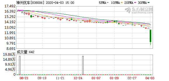 新三板挂牌的神州优车4月3日股价跌超20%。截至当日收盘,神州优车股价下跌21.75%,盘中跌破10元至9.5元/股,创下历史新低水平,市值蒸发89.4亿元。
