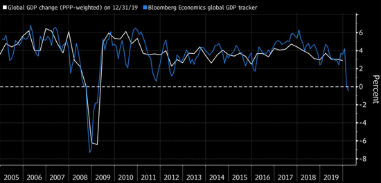 彭博全球GDP追踪器的数据显示,3月份,全球GDP折合成年率收缩0.5%,低于2月份的增长0.1%和年初的增长4.2%。
