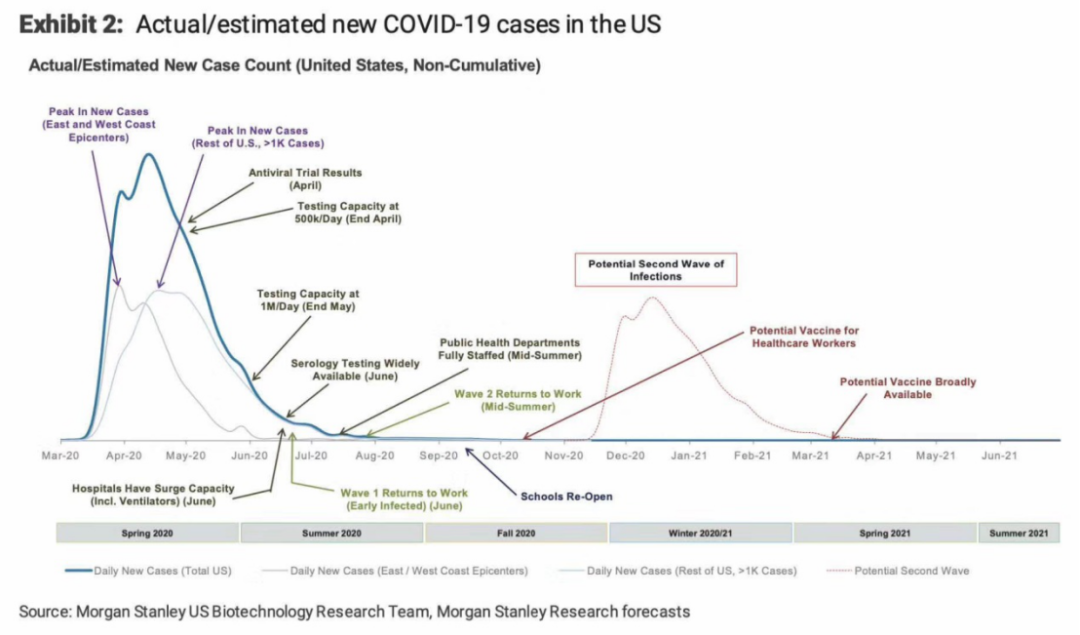 图2:实际及预测的美国新冠病例(数据来源:摩根斯坦利美国生物科技研究组)