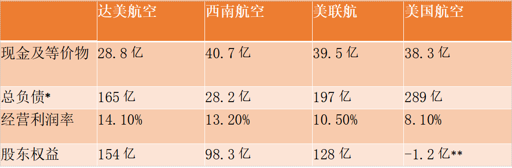 备注:*此处总负债包括长期负债及资本租赁;**美国航空公司的股东权益为负,系2012年经历破产重组。