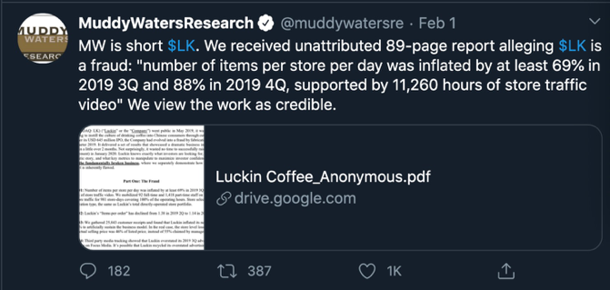 今年1月31日,浑水称收到了一份关于瑞幸咖啡的匿名报告,浑水认为报告内容属实,在官方推特上发布了这份做空报告。报告认为,瑞幸咖啡从2019年第三季度开始捏造财务和运营数据,夸大门店的每日订单量、每笔订单包含的商品数、每件商品的净售价,从而营造出单店盈利的假象。又通过夸大广告支出,虚报除咖啡外其他商品的占比来掩盖单店亏损的事实。
