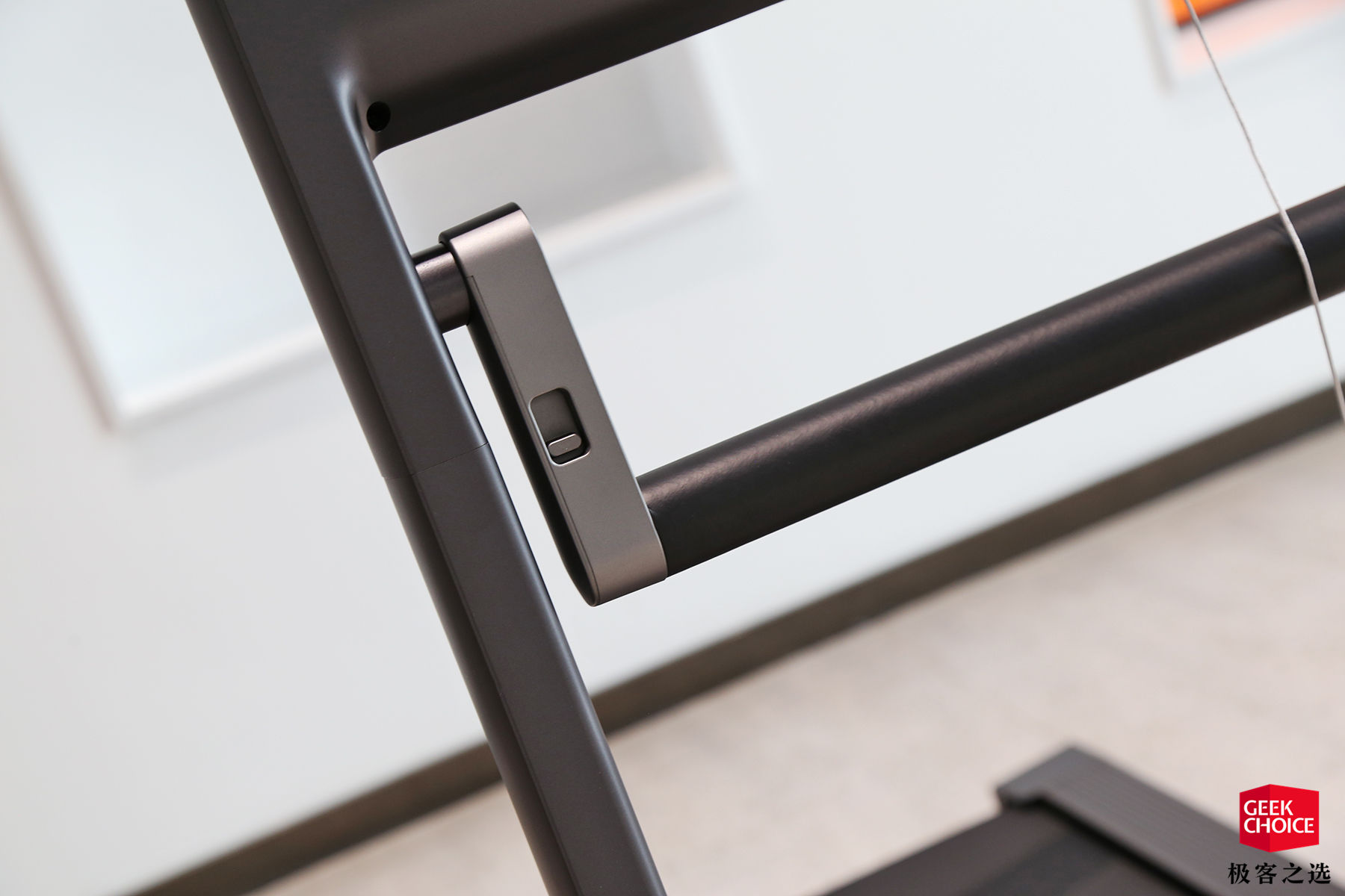 安全扶手表面为皮革材质,好处是显而易见的,即便运动过程中手心出汗,也依旧不会轻易出现手掌打滑的问题。值得一提的是,它也同样支持折叠操作,华米在其左右两侧均设置了一个控制按钮,你可以通过它们非常方便地放下或者收起扶手。