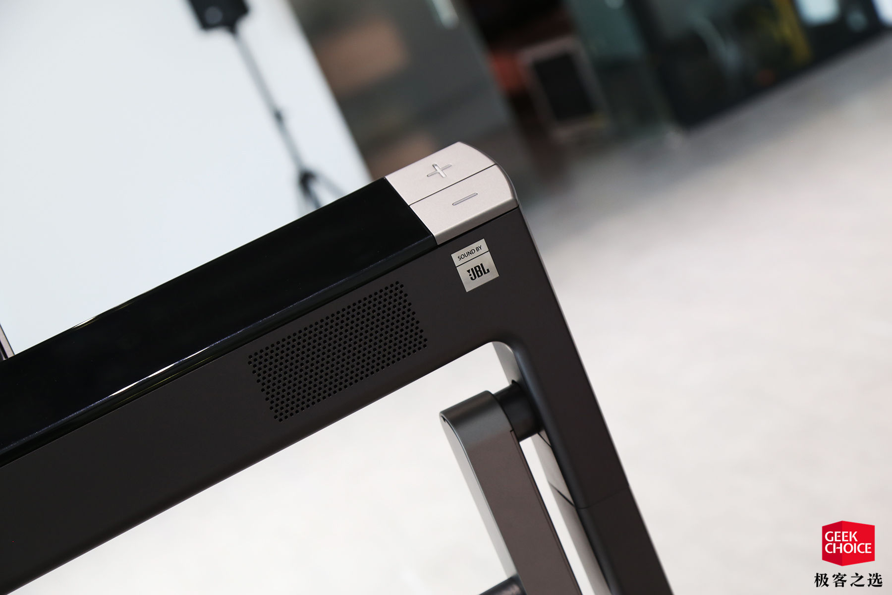 除了以上我们提到的这些,这款产品还有一个很特别的点,其内置了两个 JBL 定制的环绕立体声音箱,分别位于显示面板下方左右两侧。从我们的实际体验来看,这两个音箱无论在声音响度还是音质表现上,都有着非常不错的表现,有点买跑步机送音箱的感觉。