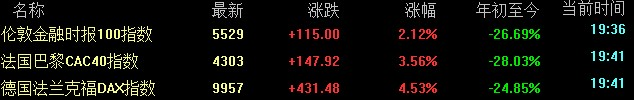 欧股全线大涨,德国DAX指数涨4.53%,英国富时100指数涨2.12%,法国CAC40指数涨3.56%。