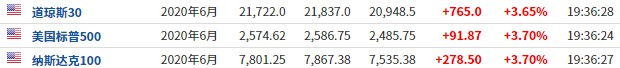 美股盘前,道指期货涨765点,报21722点,涨幅为3.65%;标普500指数期货涨3.70%,报2574.62点;纳指期货涨3.70%,报7801.25点。