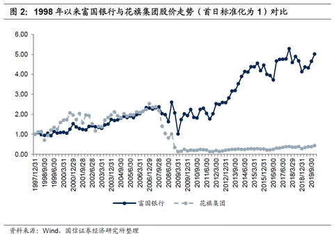 两者的股价表现也与业绩相匹配。如果投资者在1998年初买入富国银行,则在2001年之前卖出获得的回报率不如花旗集团,2002~2006年之间卖出所得大致相当,2007年及之后卖出就差很远了。