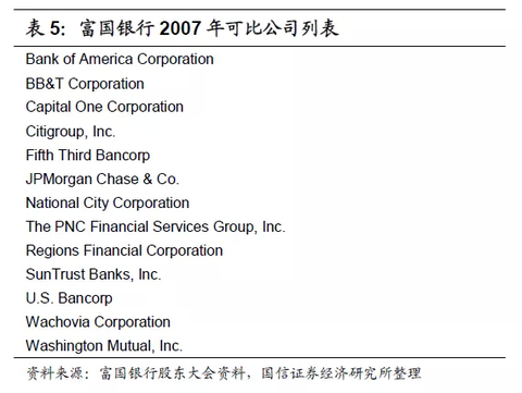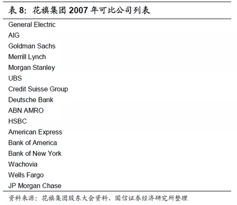 最后,从可比公司列表来看,花旗集团与富国银行有明显差别。作为一家国际性银行,花旗集团的可比公司中有多家国外金融机构(如HSBC等);由于花旗集团混业程度高(我们将在下文中予以展示),其可比公司中也有很多非商业银行机构(如Goldman Sachs等)。