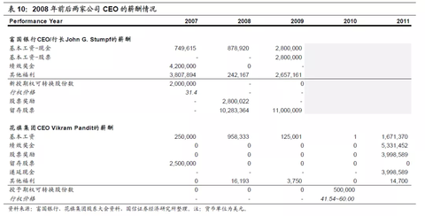 富国银行在2008~2009年之间虽然绝对利润下滑,但相对同业的表现非常优秀。CEO兼行长John G. Stumpf的薪酬发放情况如下: