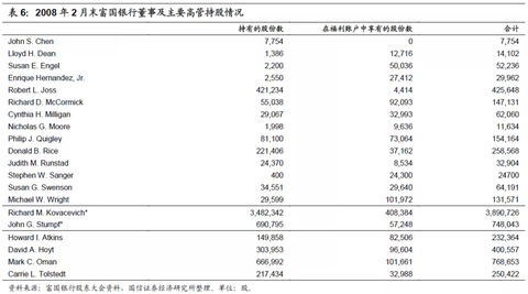 富国银行与花旗集团(C.US)股权极度分散,因此我们不关注其股东,而主要关注董事会和管理层情况及其考核激励机制。我们分析后发现: