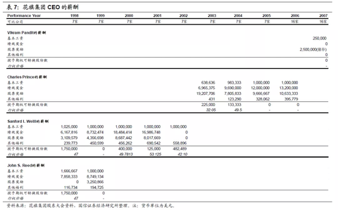 2007年董事会调整了薪酬政策,一是降低了总奖金中的现金占比;二是由于业绩没有达标,因此高管的总奖金被取消。但同时考虑到部分高管“具备花旗集团实现短期和长期复苏所必需的技能”,因此为这些高管设定了股票留存计划和现金留存计划,相当于把取消的奖金留到未来几年,视未来的表现再决定是否补发;三是设定了一个三年期的量化激励机制(2007下半年~2009年),如果管理层完成股价和ROE相关的两个任务指标,可以额外发放股票奖励。