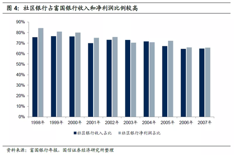 在样本区间内,富国银行按客群将其业务划分为三大块:社区银行、批发银行和富国金融(2001年之前住房按揭业务单列,之后则并入社区银行,因此我们将2001年之前的住房按揭业务也调整到社区银行中)。其中社区银行主要为个人客户和小微企业提供金融服务,批发银行服务大中型对公客户,富国金融则主要向个人提供消费贷款业务。