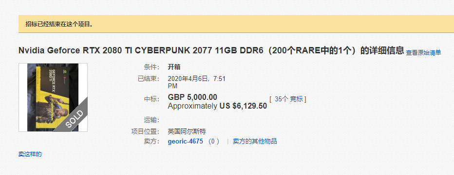 毫不意外地,有些人中奖之后转手就在eBay上拍卖这款显卡,经过多次竞拍之后英国一位玩家以5000英镑、约为6129.5美元(折合人民币4.3万元)的价格卖出了这款GeForce RTX 2080 Ti“ Cyberpunk 2077 Edition显卡。