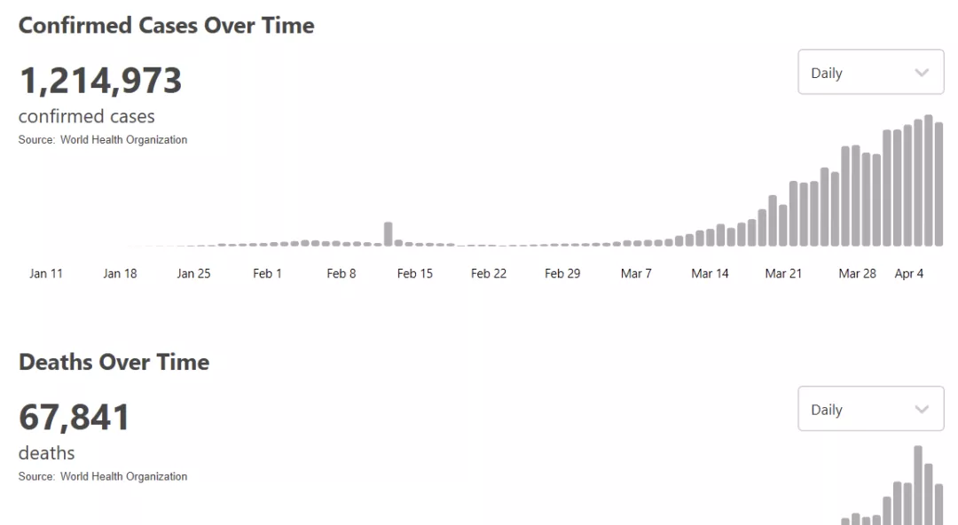 当地时间4月6日晚,世卫组织更新实时统计数据,目前全球确诊新冠肺炎1214973例,死亡67841例,中国以外超过113万例。