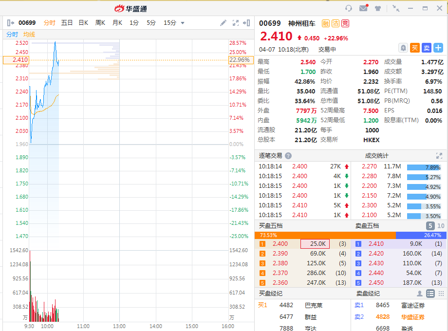 新浪港股讯 4月7日消息,瑞幸咖啡财务造假,上周五神州租车股价暴跌54%,今日早晨发布澄清公告,公司表示未持有瑞幸咖啡的任何股份。今日早盘,神州租车走势反复,股价高开16%后一度跌超10%,此后再度大幅反弹。截至发稿,神州租车暴涨22.96%,报价2.41港元。