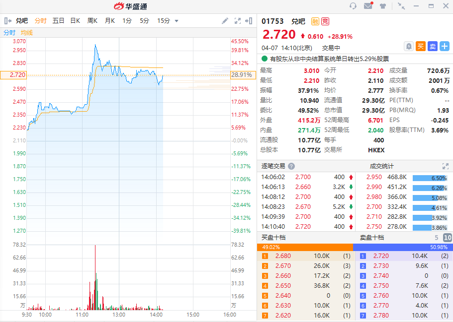 华盛资讯4月7日讯,兑吧(01753)因昨日控股股东宣布延长禁售期,并且发布增持计划,今日股价大涨。截至发稿,兑吧大涨28.91%,现报2.72港元每股,当前成交额2001万港元,当前总市值29.3亿港元。