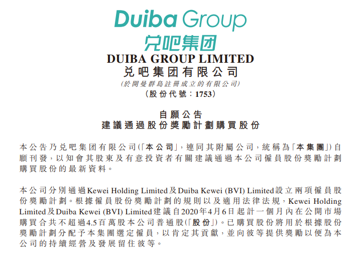 兑吧(01753)发布公告,控股股东承诺禁售期延长至上市后3年、核心管理层承诺禁售期延长至上市后2年、同时员工持股平台将在未来一个月内增持最多450万股。