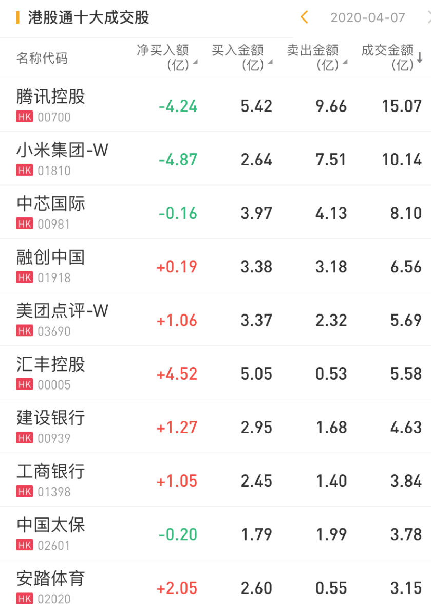 今日净买入汇丰控股4.52亿港元,净买入美团点评1.06亿港元,净买入建设银行1.27亿港元,净买入工商银行1.05亿港元。