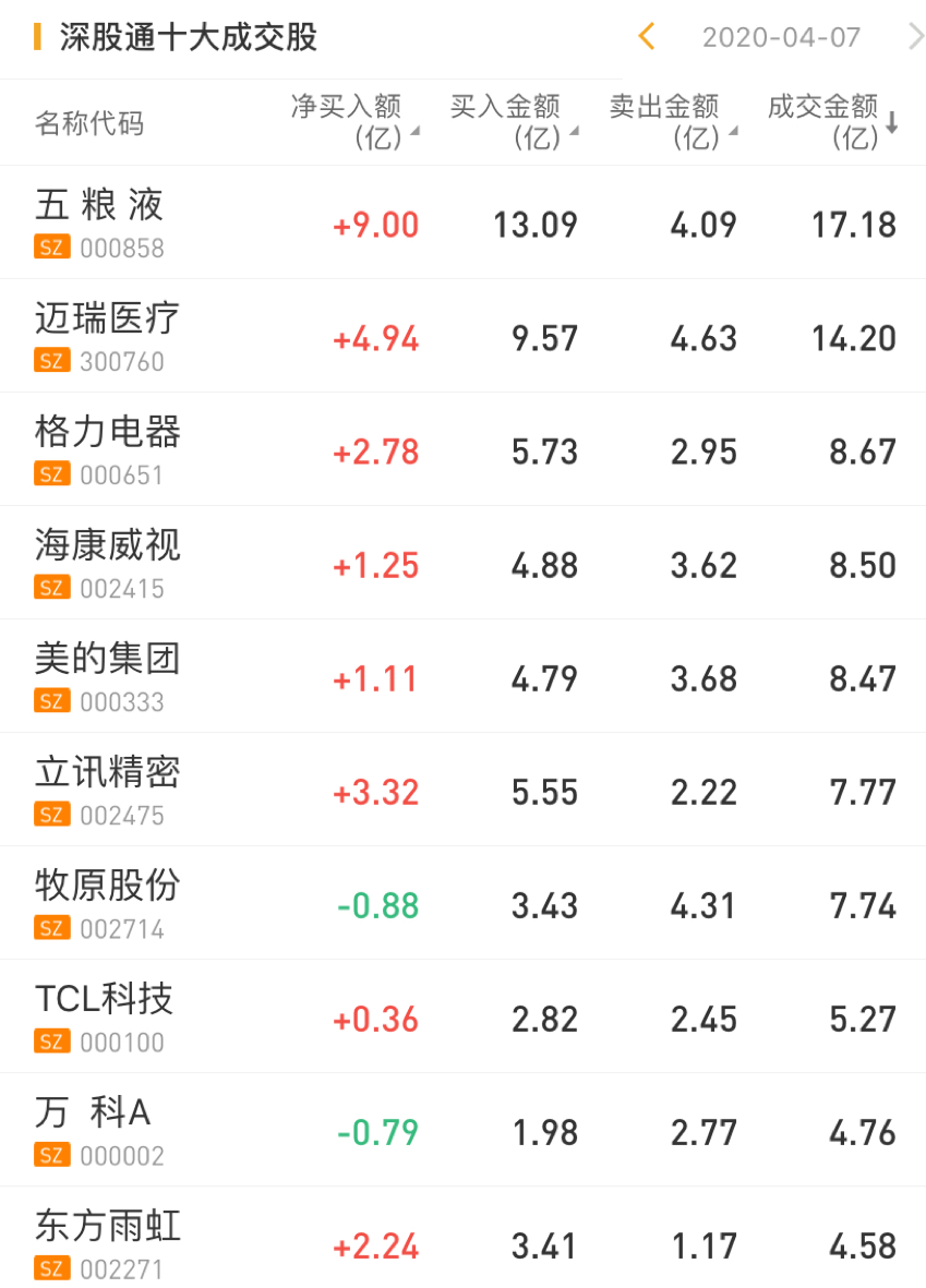 深股通净买入迈瑞医疗4.94亿元,净买入五粮液9亿元,净买入格力电器2.78亿元。
