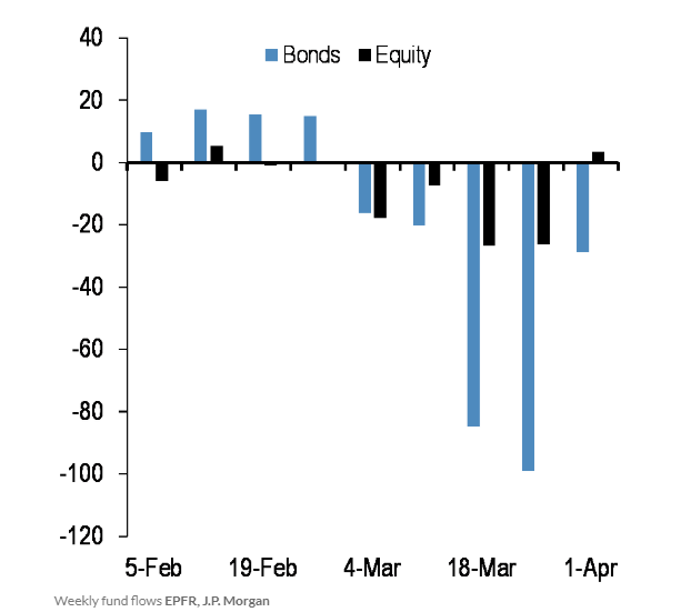 但摩根大通称,个人投资者的恐慌性阶段或许已经结束。上周数据显示,美股个人投资者放慢了出售债券基金的步伐,同时开始买入股票型基金,这是2月市场大跌以来的第一次。
