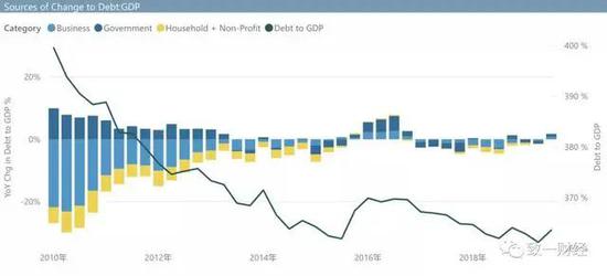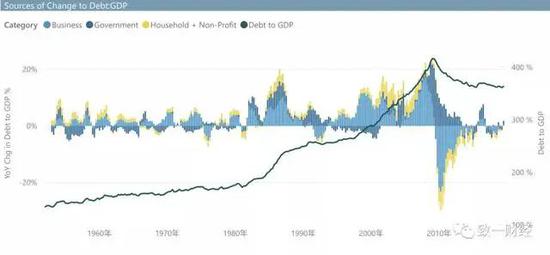 2000年到2010年,美国债务增长中居民部门占了大头(次贷危机的根源)(图中黄色的部分是居民债务对总体债务增长的贡献程度),但是这十年居民部门的贡献度几乎都是负的,反而是政府部门贡献了绝大多数债务增长(政府支出成为美国经济的增长的顶梁柱之一,2013年到2015年政府对GDP贡献度翻了一番)