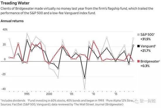 (红线为桥水Pure Alpha II的收益,黑线为Vanguard一个股债混合型指数基金收益,绝大部分年份费率极低的指数基金收益都高于Pure Alpha II)