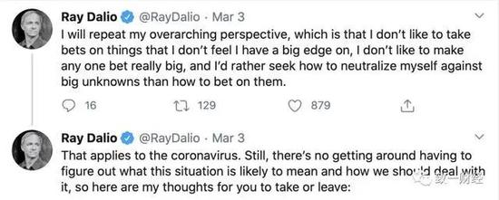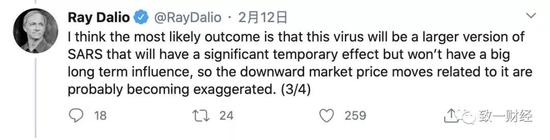 2月11日达里奥说市场过于夸大了病毒的影响,“很快可以预见有反弹(I would expect more of a rebound)”。2月12日达里奥补充说“病毒最可能的结果是扩大版的SARS,只是在短期(temporary effect)内有显著的影响,但是长期影响不大,因此市场价格下行可能只是过度反应了(exaggaerated)。”